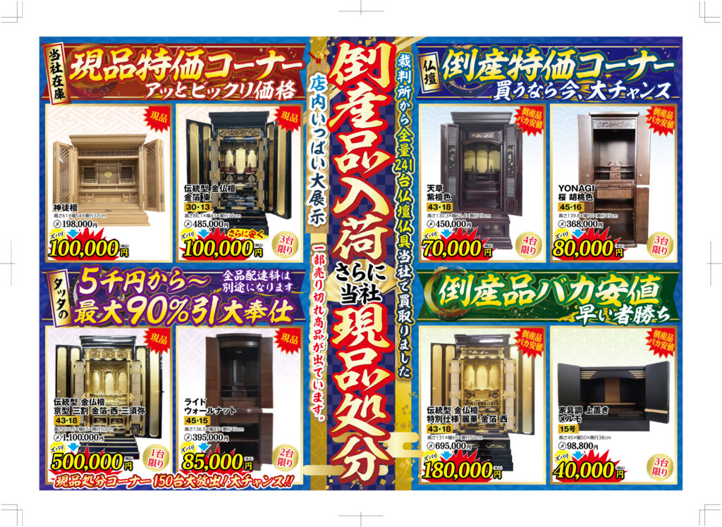期間中は他社倒産品大処分・決算特別現品処分特別価格にて、ご提供させていただきます。