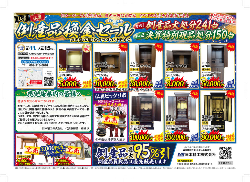 4月11日(土)~4月15日(水)、鹿児島支店にて仏壇・仏具展示会を開催いたします。